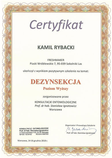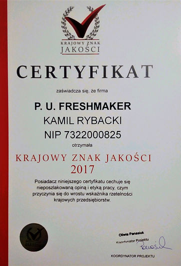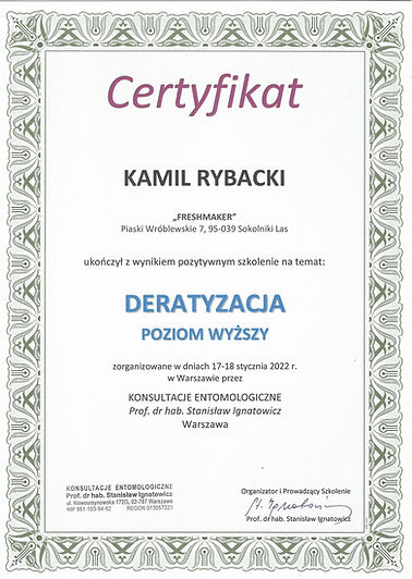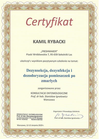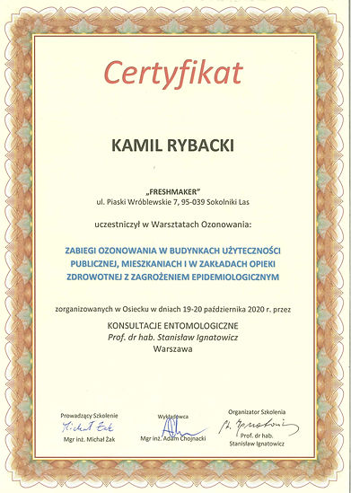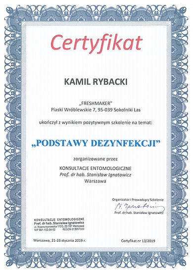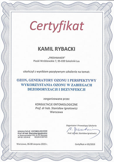 Firma Fresh-Maker jest firmą Certyfikowaną w dziedzinie dezynsekcji, dezynfekcji i ozonowania.